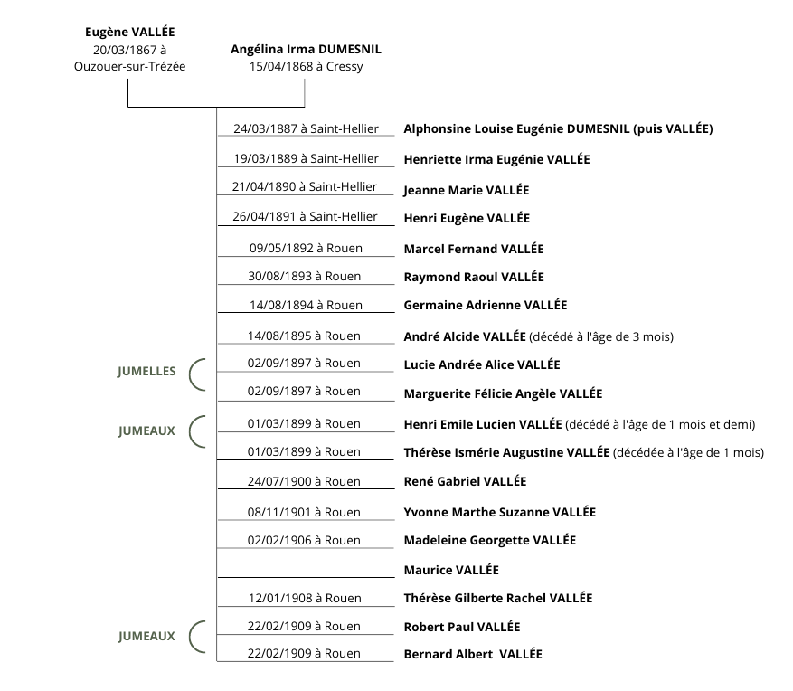 Malgré leur union, Irma et Eugène ne vont à priori pas vivre ensemble dès le début car leurs quatre premiers enfants vont naître au domicile de leurs grands-parents maternels à Saint-Hellier. Le couple part ensuite s’installer à Rouen entre 1891 et 1892, rue de Sotteville, où va naître leur cinquième enfant, Marcel. Eugène est, à ce moment, employé aux abattoirs tandis qu’Irma demeure femme au foyer. À partir de là, elle va donner naissance presque tous les ans et demi à un enfant, dont trois fois des jumeaux. Mon arrière grand-mère Lucie voit le jour le 2 septembre 1897 avec sa soeur jumelle Marguerite (qui décèdera une quinzaine d’années plus tard). La fratrie s’agrandit petit à petit jusqu’en 1909.